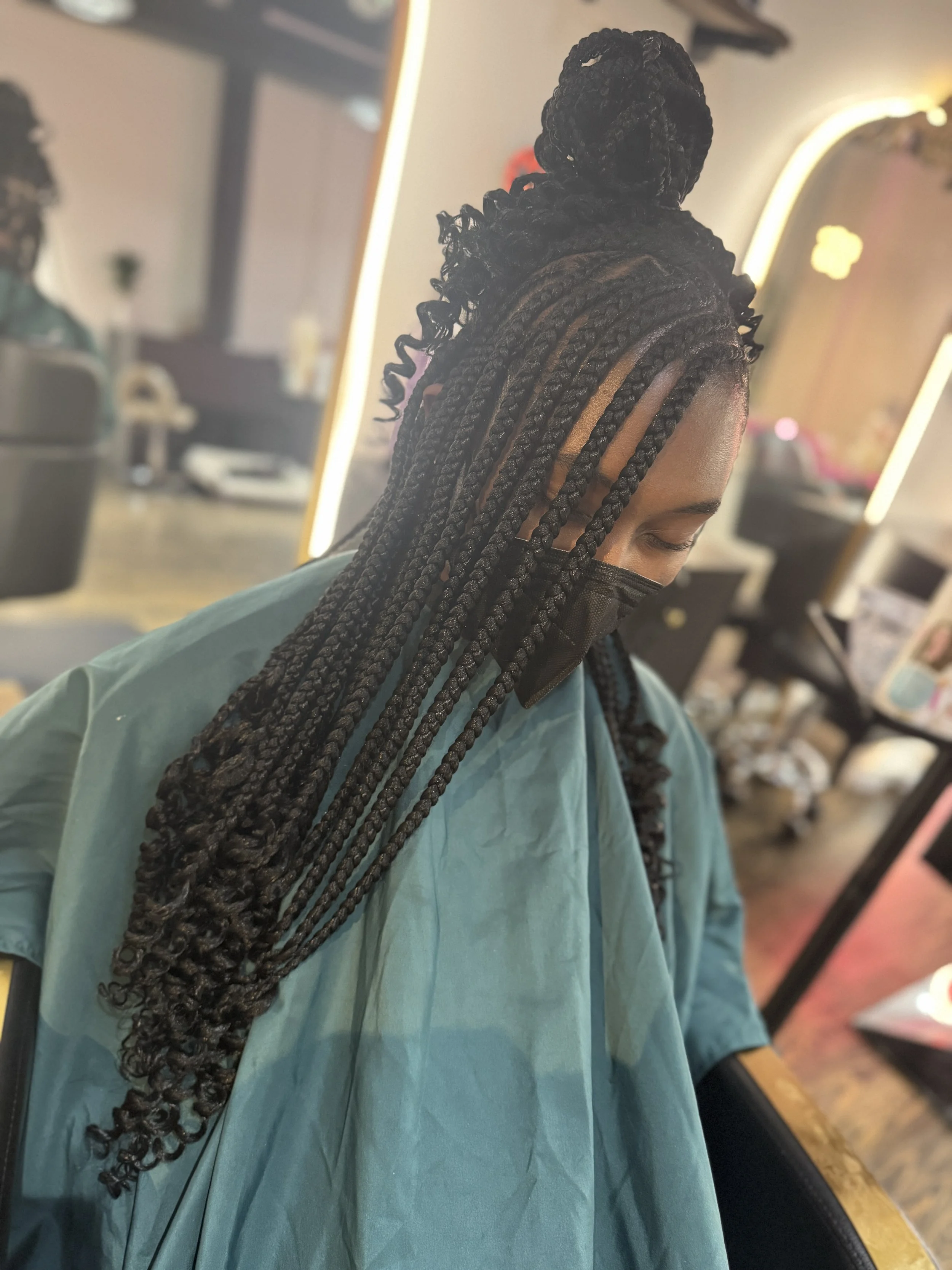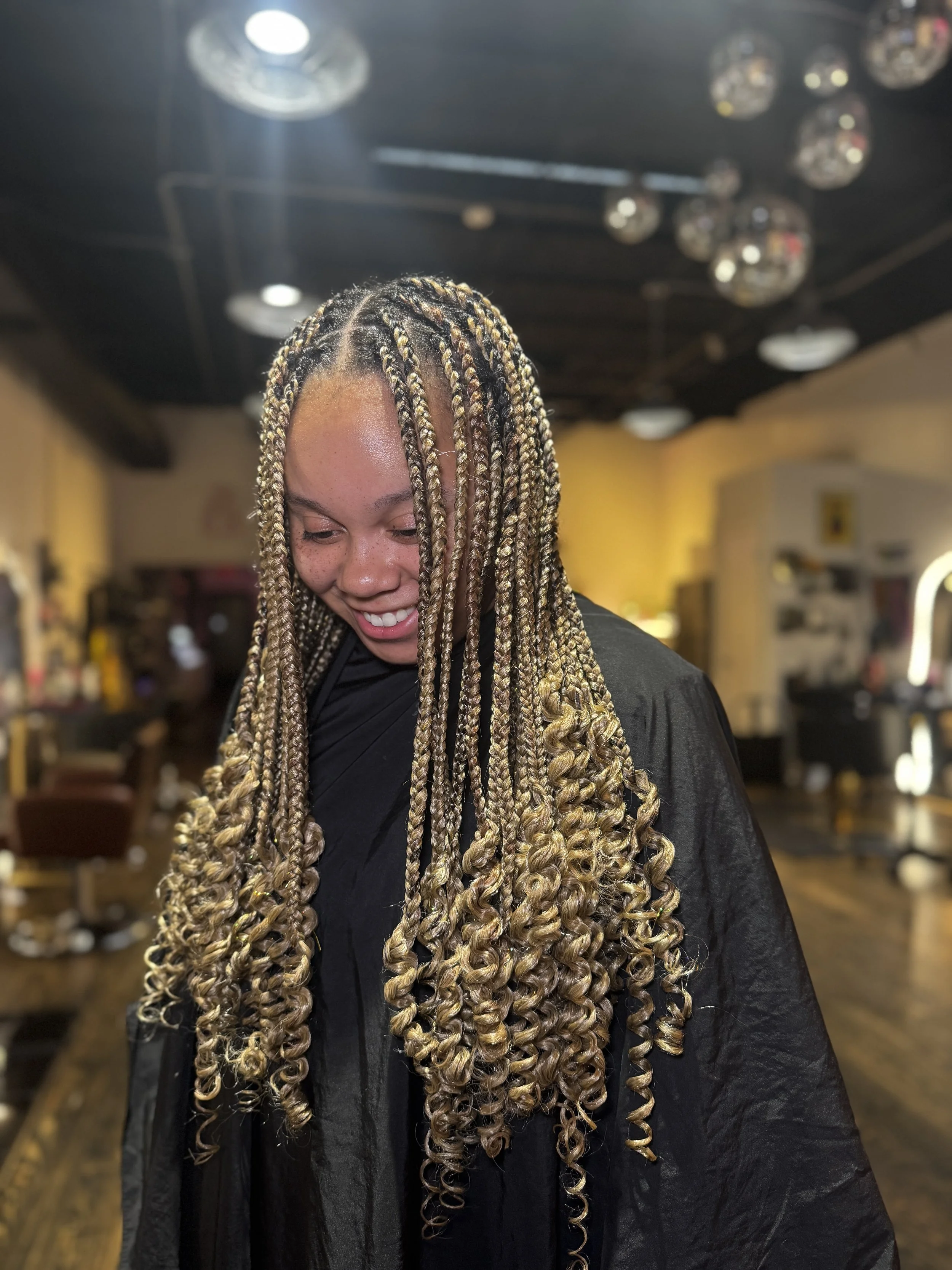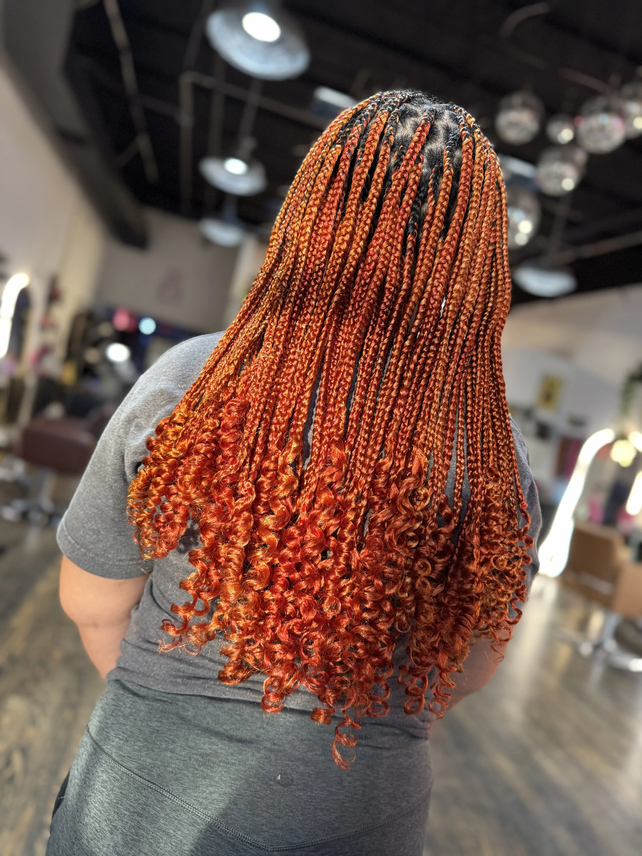 Large boho knotless braids in Pumpkin Spice with 350 curly pieces