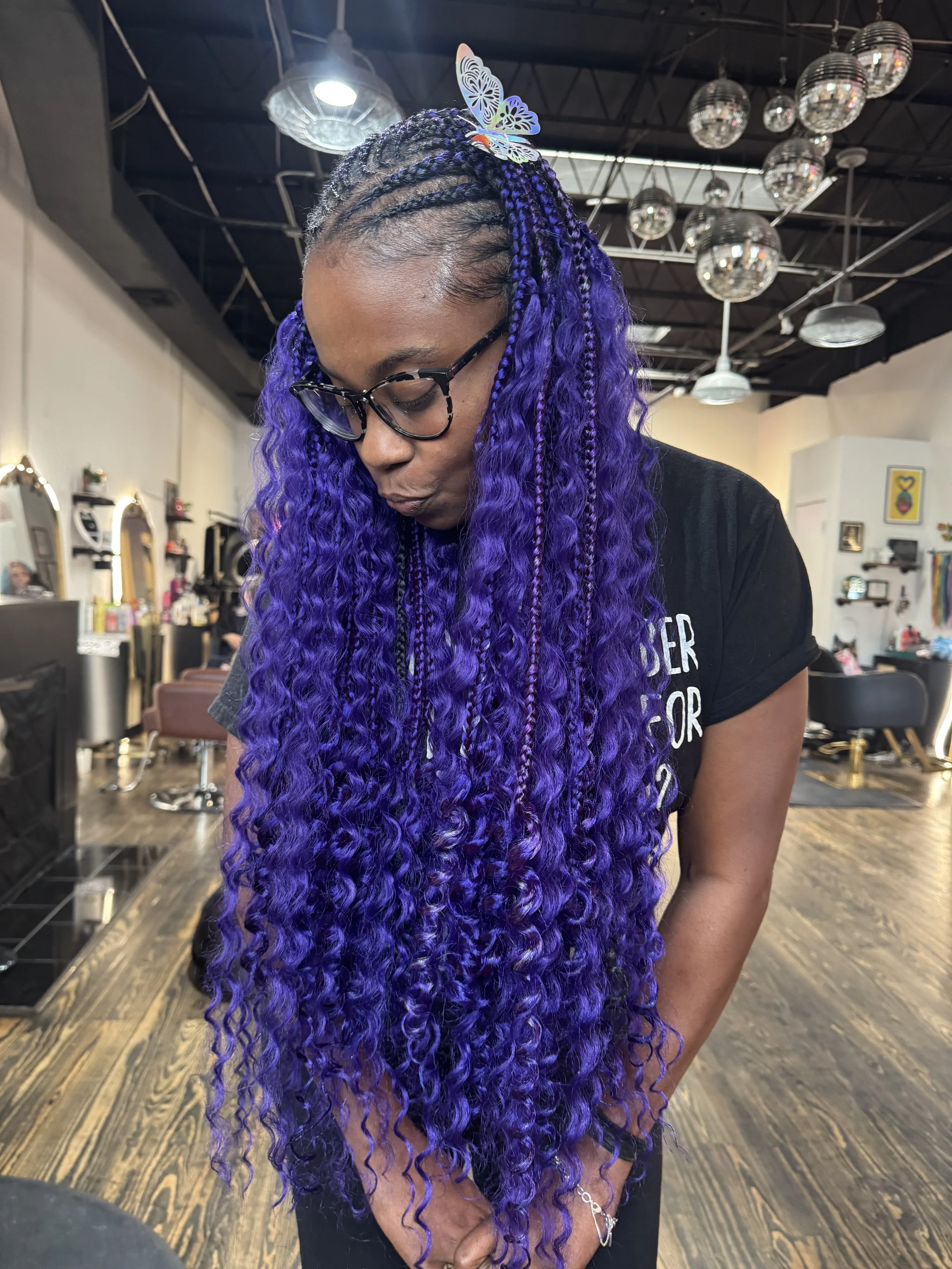 Large goddess knotless with a 1b base, and streaks of 1b/Blue and 1b/purple